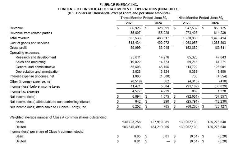 全球能源存儲技術及能源軟件服務提供商Fluence,8月11日公布了截至 2025 年 6 月 30 日的財年第三季度財務業績:該季度收入達 6.025 億美元,較去年同期的 4.83 億美元增長 24.7%;調整后的息稅折舊及攤銷前利潤為2740萬美元,2024年第三季度為1560萬美元。